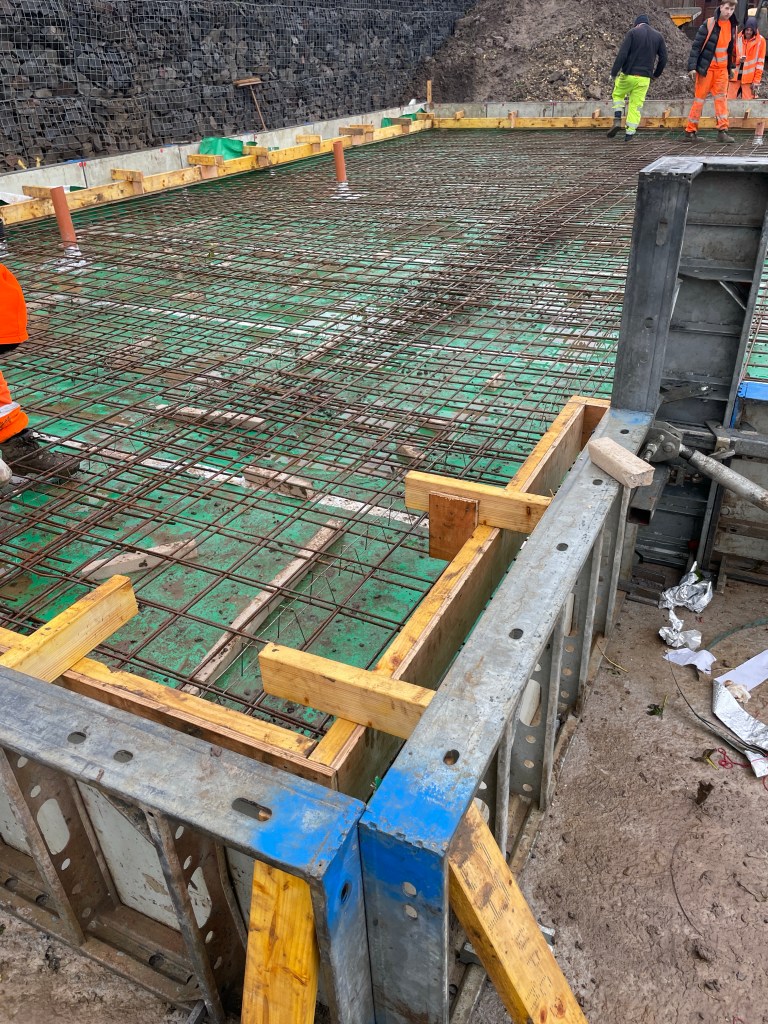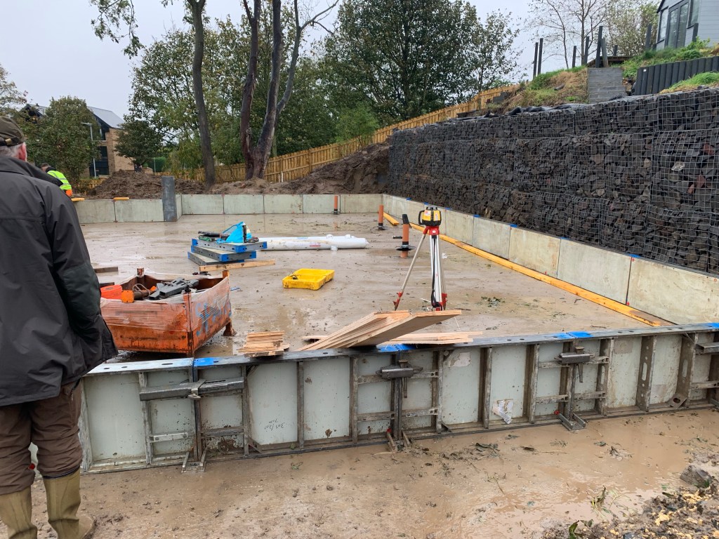 Over the weekend the form work was set up and all the wood to enable the upstand to be poured at the same time as the slab,