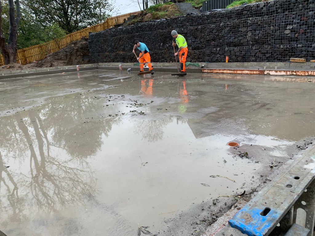Friday, power float day, but the slab is now basically a swimming pool so the ground workers had to remove the water. But as there is no gaps in the upstands , they have to cut the pop ups and push the water through the drains .. how this will be fixed is another problem