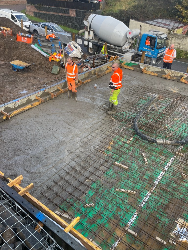 Finally about 9.30 the first concrete truck arrives and after much faffing (it appears) the pump starts and the concrete flows.