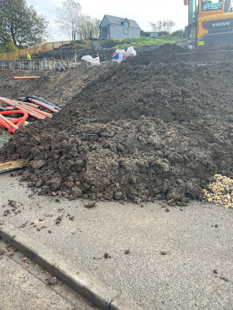 Successful day or is it …. Waiting for the lorrys to arrive to take some muck away. The digger pushes too much soil, gets stuck and the mound of earth collapses through the Heras Fencing, breaking the posts and blocks the pavement 🤷🏻♂️